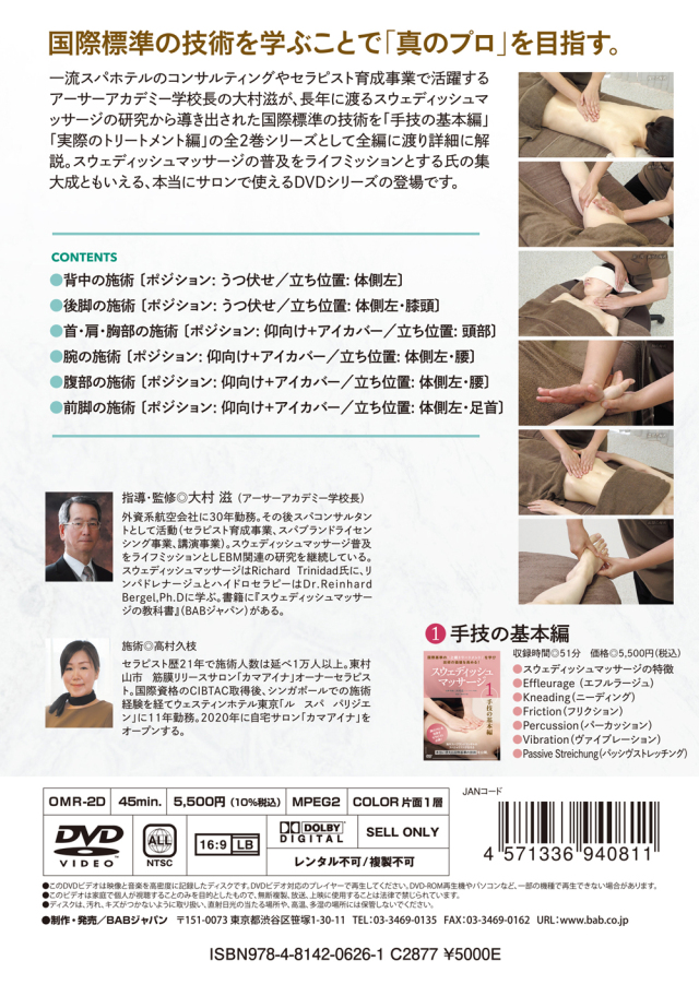 一流スパホテルのコンサルティングやセラピスト育成事業で活躍するアーサーアカデミー学長の大村滋が、長年に渡るスウェディッシュマッサージの研究から導き出された国際標準の技術を「手技の基本編」「実際のトリートメント編」の全2巻シリーズとして全編に渡り詳細に解説。スウェディッシュマッサージの普及をライフミッションとする氏の集大成ともいえる、本当にサロンで使えるDVDシリーズの登場です。